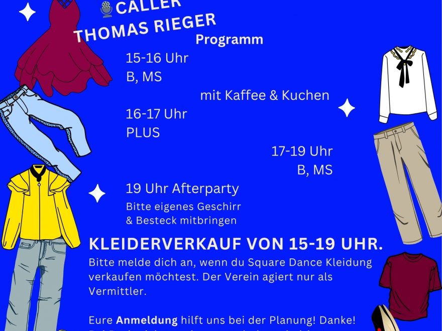 Am Samstag, den 22. März 2026, laden die Stoke-Boat-Promenaders wieder zum Kleiderkreisel ins D.A.I. Tübingen ein. Wer Lust auf Square Dance, Second-Hand-Schätze und geselliges Beisammensein hat, sollte sich diesen Termin vormerken! Was erwartet euch? 🧥 Second-Hand-Verkauf von Square-Dance-Kleidung Von 15:00 bis 19:00 Uhr könnt ihr stöbern, anprobieren und einkaufen. Eure Anmeldung hilft uns bei der Planung – danke dafür! Der Verein agiert nur als Vermittler – wer selbst Kleidung verkaufen möchte, meldet sich bitte per E-Mail oder Telefon bei Ida (president@stoke-boat-promenaders.de; 01577-6836879) 💃 Tanzprogramm mit Caller Thomas Rieger 15:00–16:00 Uhr: Basic & Mainstream 16:00–17:00 Uhr: Plus 17:00–19:00 Uhr: Basic & Mainstream Bei Basic richten wir uns nach dem niedrigsten Tanzniveau unserer Gäste. ☕ Kaffee & Kuchen Für die Stärkung zwischendurch ist gesorgt. Bitte bringt eigenes Geschirr und Besteck mit. 🎉 Afterparty ab 19:00 Uhr Wer mag, bleibt einfach da – zum Plaudern, Essen und Spaß haben.