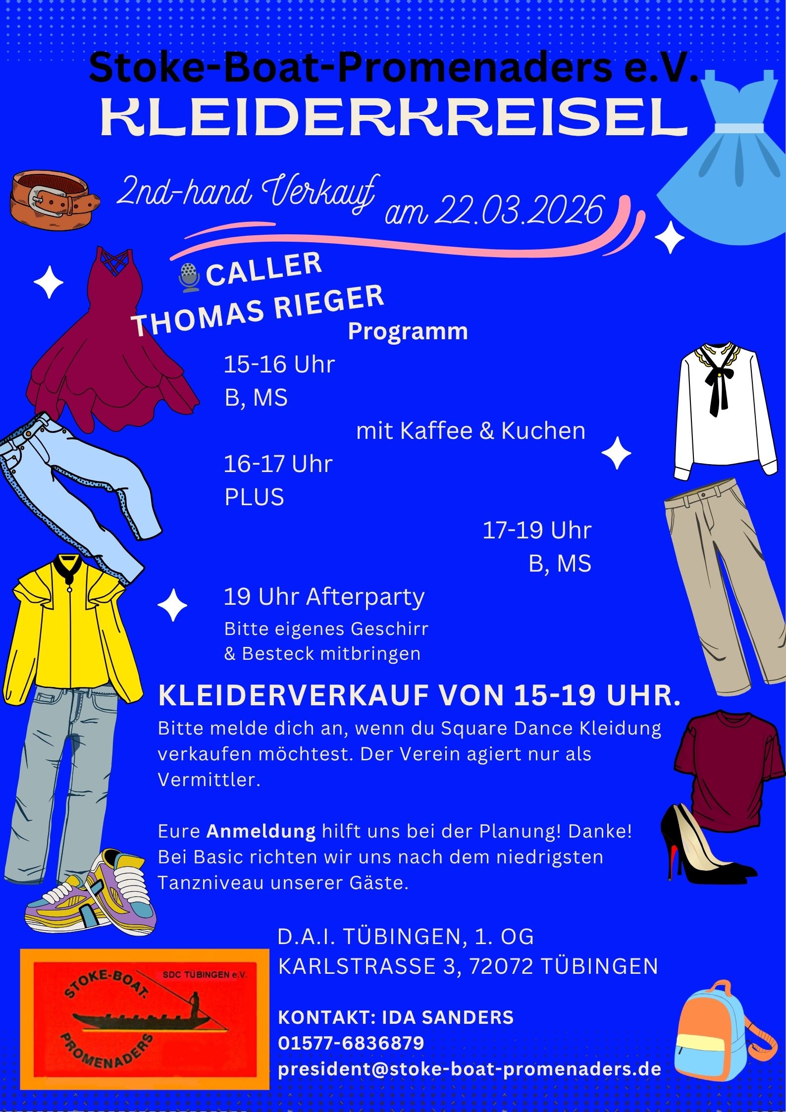 Am Samstag, den 22. März 2026, laden die Stoke-Boat-Promenaders wieder zum Kleiderkreisel ins D.A.I. Tübingen ein. Wer Lust auf Square Dance, Second-Hand-Schätze und geselliges Beisammensein hat, sollte sich diesen Termin vormerken!